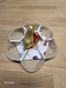 Die kleine Ostermöhre als Geschenkverpackung für ein paar Süßigkeiten zu Ostern. Das Orange der Möhre ist ca. 15 cm hoch.